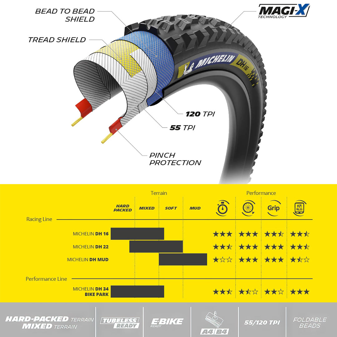 - Boost your speed on hard-packed and mixed terrain thanks to the new tread pattern inspired by the original Michelin DH16 tyre